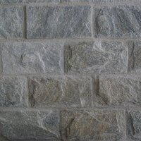 Harmaa, kupera liuskekivilaatta, jossa hillitty kiille. Laatan koko 20x10 cm, vahvuus n. 1,5 cm. Seinien verhoiluun.